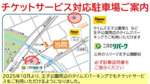 従来ご利用いただいておりましたコインパーキングに加えて、王子公園周辺のタイムズパーキングでもご利用いただけるようになりました。お車でご来院の患者様はご利用ください。